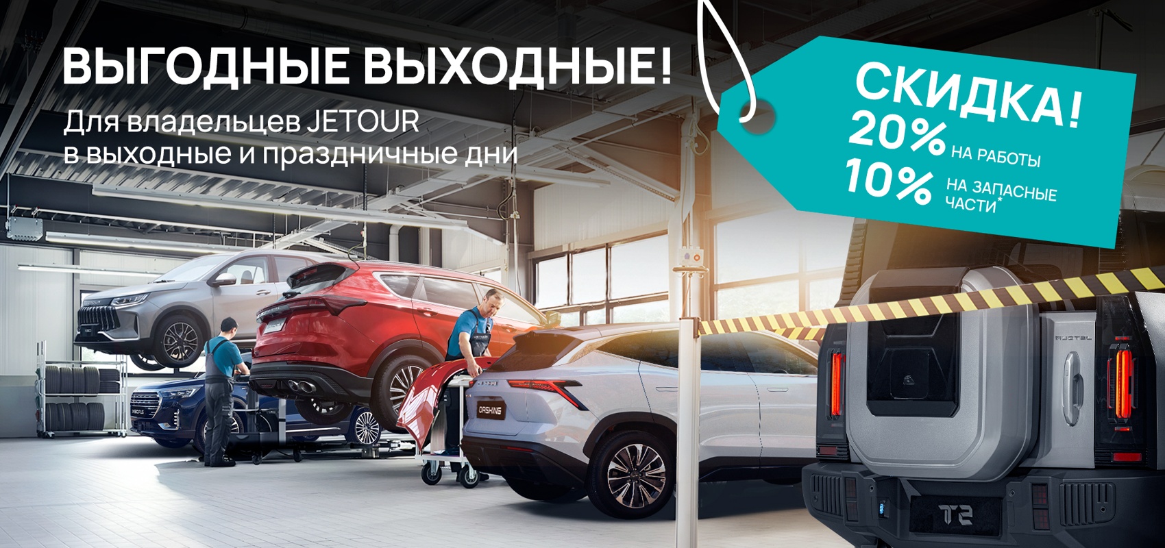 Для владельцев Jetour в выходные и праздничные дни скидка на сервисное обслуживание автомобиля! 20% на работы и 10% на запасные части.*